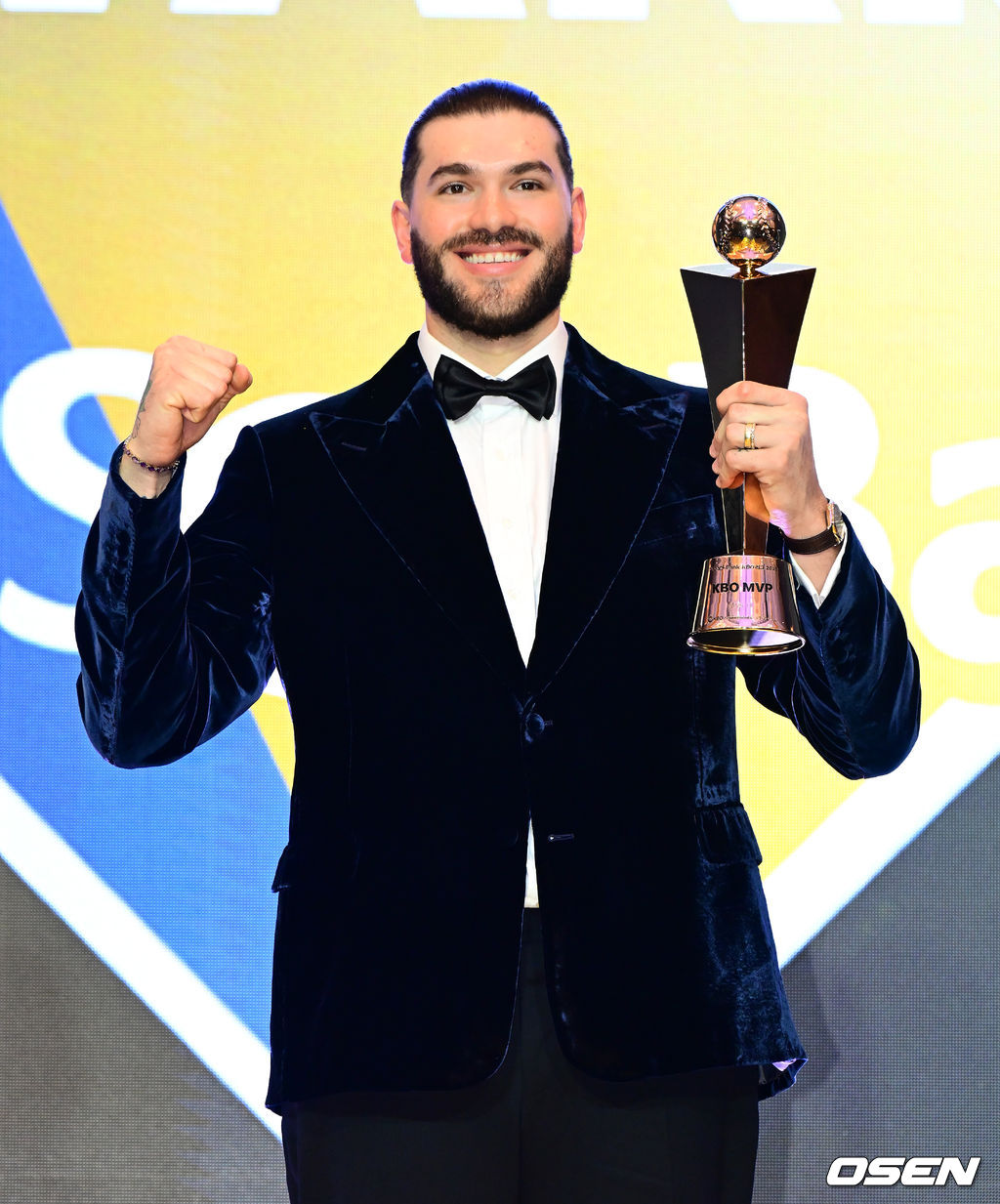 예상대로였다. 한화 이글스 코디 폰세(31)가 2025시즌 MVP로 선정됐다. 폰세는 기자단 투표 124표 중 96표(76%)를 얻어 23표에 그친 르윈 디아즈(삼성)를 제치고 수상했다. SSG 앤더슨, 삼성 후라도, NC 라일리, KT 안현민, 롯데 레이예스가 각각 1표식 얻었다. 폰세는 부상으로 The Kia EV6 전기차를 부상으로 받았다.