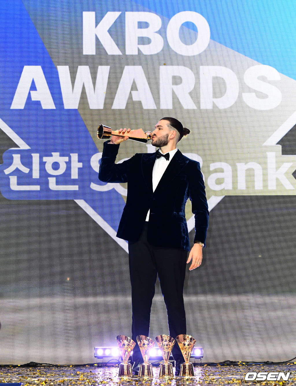 MVP 한화 폰세가 트로피에 키스를 하고 있다. 2025.11.24 /jpnews@osen.co.kr
