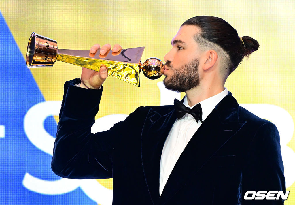 MVP 한화 폰세가 트로피에 키스를 하고 있다. 2025.11.24 /jpnews@osen.co.kr