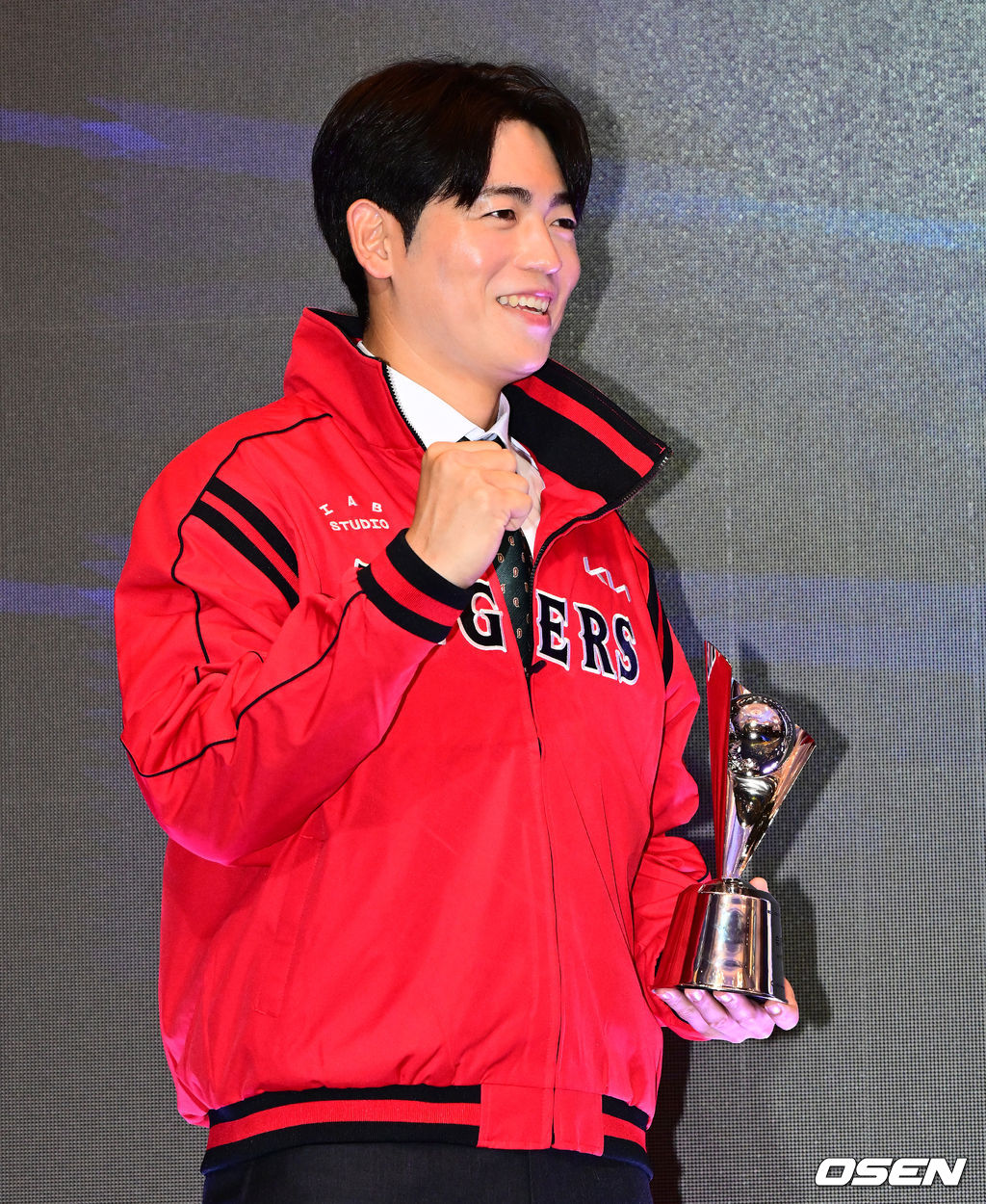 한화 소속으로 퓨처스 북부리그 승리상을 수상한 이태양이 시상식을 마치고 KIA 점퍼를 입고 포즈를 취하고 있다. 이태양은 2차 드래프트로 KIA에 지명됐다. 2025.11.24 /jpnews@osen.co.kr