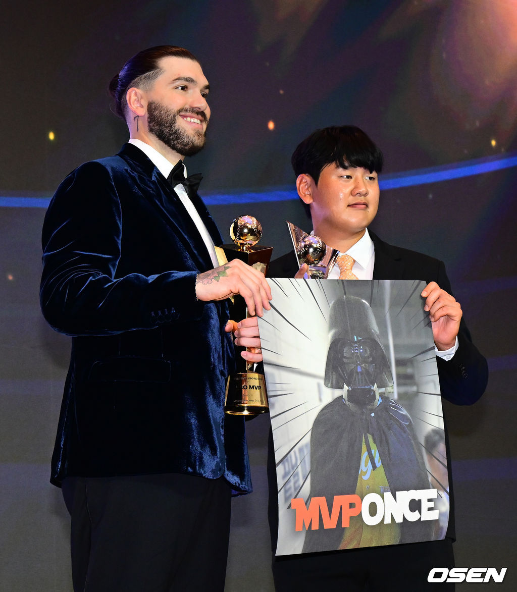 MVP를 수상한 한화 폰세와 퓨처스 북부리그 타율상 장규현이 기념 촬영을 하고 있다. 2025.11.24 /jpnews@osen.co.kr