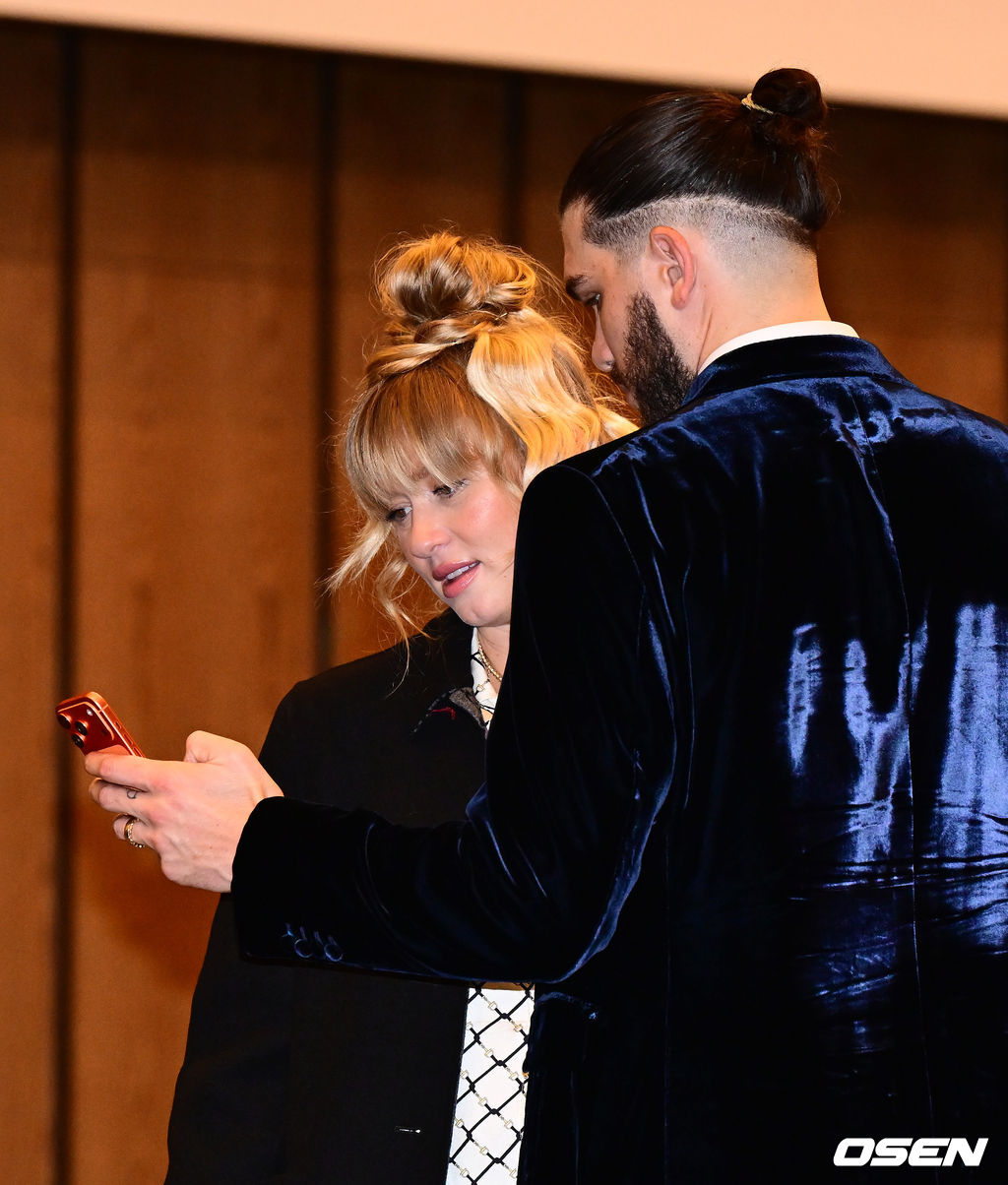 시상식을 마치고 MVP를 수상한 한화 폰세가 아내와 이야기를 나누고 있다. 2025.11.24 /jpnews@osen.co.kr
