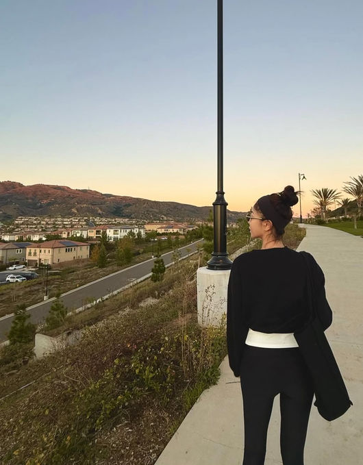 이날 김윤지의 패션 컬러는 블랙이었다. 모자, 선글라스, 이너, 아우터에 레깅스까지 모두 블랙을 착용한 그는 처음에는 선글라스를 끼고 일명 '얼빡샷'을 찍다가 나중에는 드넓은 저택가를 바라보고 있는 자신의 뒷모습을 담은 사진을 공개했다. 출산 전에도 만삭이라고는 믿기지 않은 몸매를 자랑했던 그는 여전한 늘씬함을 자랑했다.