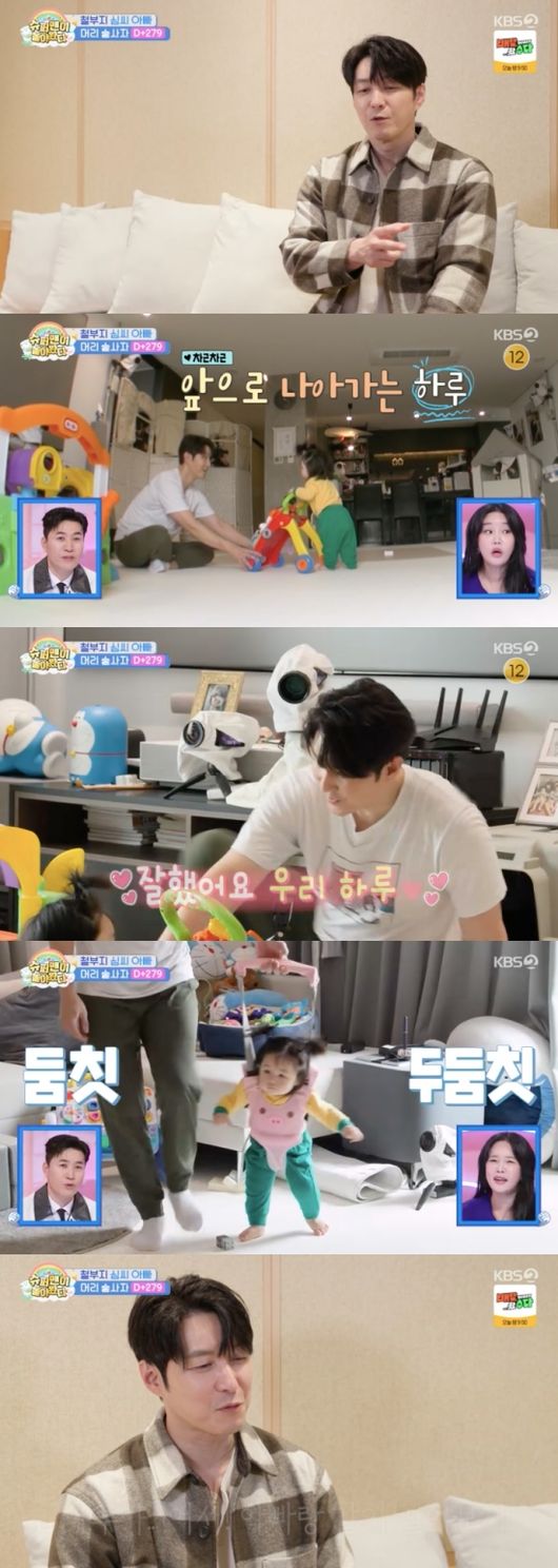 일어서기를 시도하던 심형탁의 아들은 심형탁이 꺼내든 걸음마 보조기 도움 아래 드디어 걷기 시작했다.