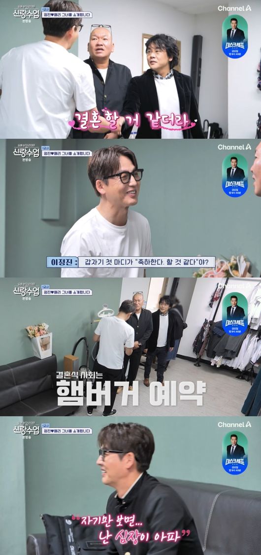 이날 이정진은 영화 ‘말죽거리 잔혹사’에서 호흡을 맞춘 이종혁, 김인권, 박효준을 만났다. 김인권은 만나자마자 “축하한다. 결혼할 것 같더라”라고 했고, 이승철도 “결혼한 사람들이 촉이 좋다. 나도 결혼할 것 같다고 느껴진다”라고 확신했다.