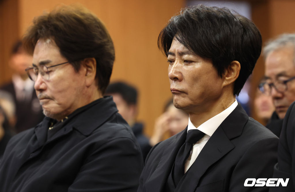 배우 유동근, 최수종이 故 이순재의 영결식에서 고인의 마지막 길을 배웅하고 있다. 2025.11.27/cej@osen.co.kr