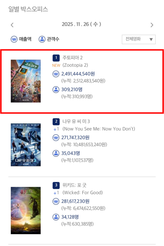 영화관입장권 통합전산망에 따르면 영화 '주토피아 2'는 개봉 첫날인 26일(수) 30만 9,210명의 관객을 동원하며, '위키드: 포 굿', '나우 유 씨 미 3'를 제치고 전체 박스오피스 1위에 올랐다.