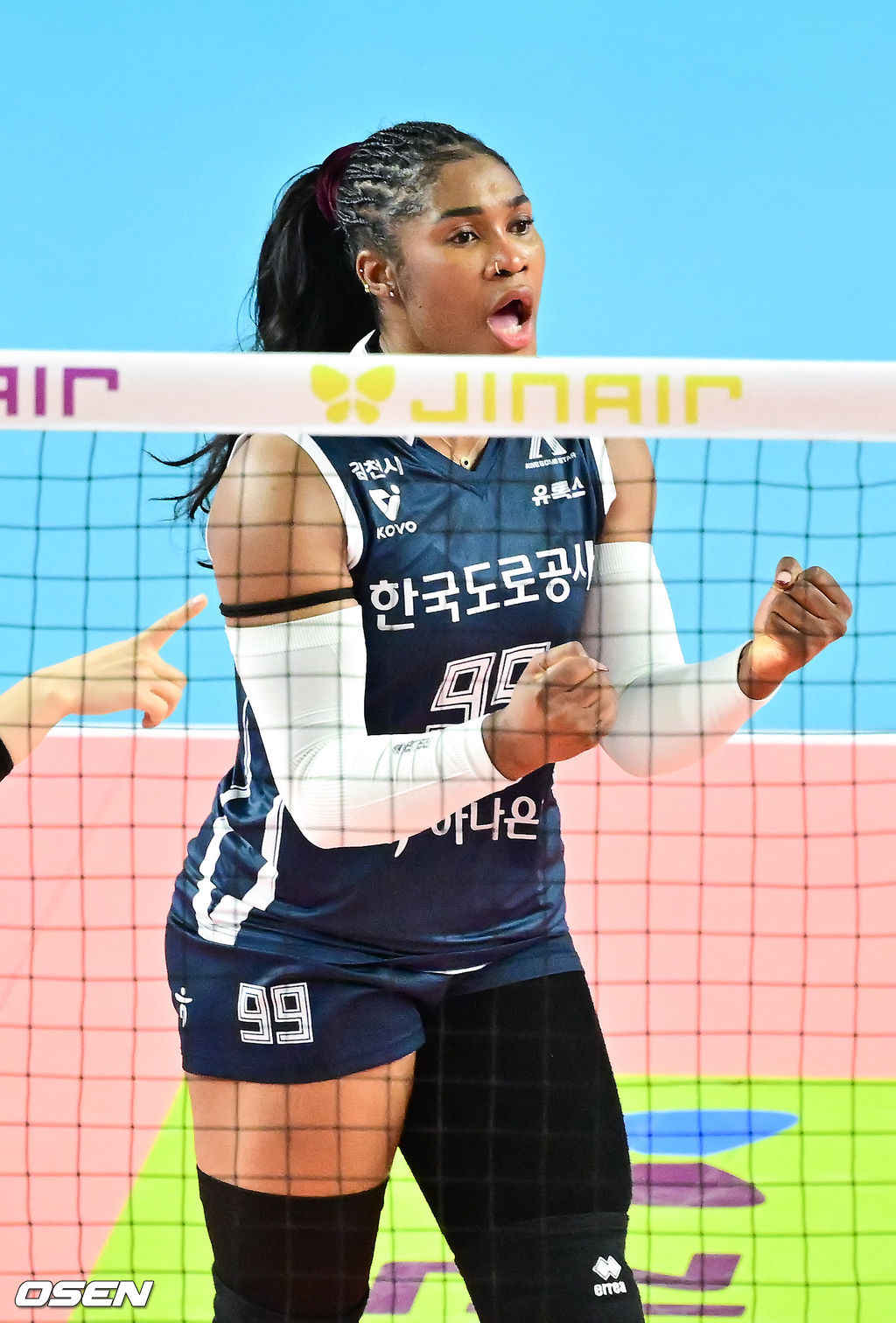 1세트 한국도로공사 이지윤의 블로킹때 모마가 주먹을 쥐며 환호하고 있다 2025.11.27 / soul1014@osen.co.kr