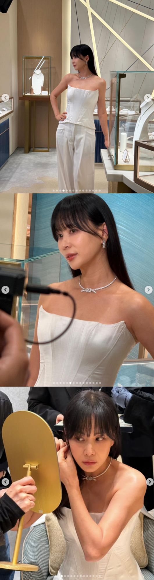 사진 속 고소영은 화이트 톱과 팬츠를 매치해 깔끔하면서도 세련된 스타일을 연출했다. 화려한 주얼리를 품은 그는 쇼케이스 앞에서도 고급스러운 분위기를 더했다.
