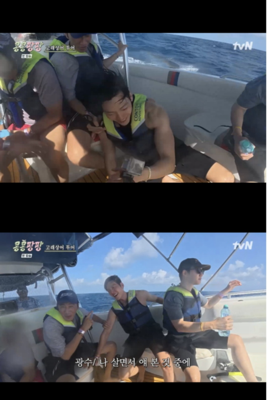 계속되는 침수 속에서 김우빈은 배를 잡고 있던 손을 놓치고 안쪽으로 굴러버리는 굴욕을 당했다. 이를 본 이광수는 “살면서 본 모습 중 제일 초라해 보였다”고 폭로하며 폭소를 자아냈다.