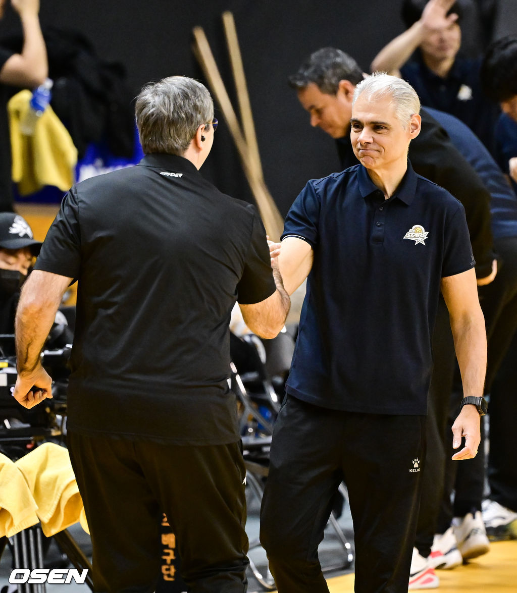 경기 앞서 현대캐피탈 필립 블랑 감독과 KB손해보험 레오나르도 아론소 감독이 인사를 나누고 있다. 2025.11.29 / soul1014@osen.co.kr