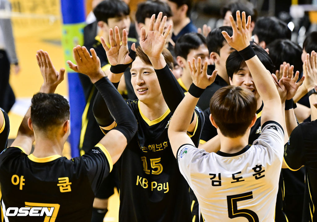 경기종료 후 KB손해보험 우상조가 동료들과 하이파이브를 하고 있다. 2025.11.29 / soul1014@osen.co.kr
