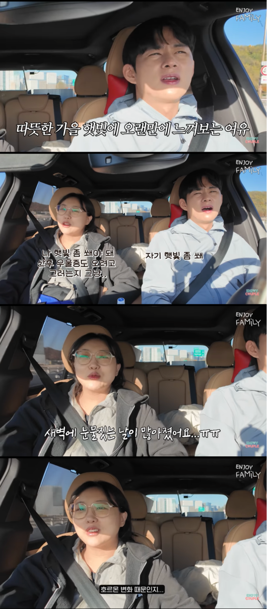 차 안으로 햇빛이 쏟아지자 손민수는 임라라에게 “자기 햇빛 좀 쐐”라고 권했다. 이에 임라라는 “나 햇빛 좀 쐐야 돼. 산후 우울증도 오려고 그러는지 그냥”이라며, 호르몬 변화 탓에 새벽에 눈물을 짓는 날이 많아졌다고 고백했다.