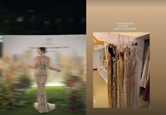 결국 민경아는 이날 오후 자신의 SNS에 “진주맨이 직접 골라준 축가 드레스. 민폐 하객 오해 금지세요!”라는 글과 드레스 사진을 게재했다. 민경아의 축가 드레스만큼 화려한 여러 벌의 드레스가 걸려 있었다.