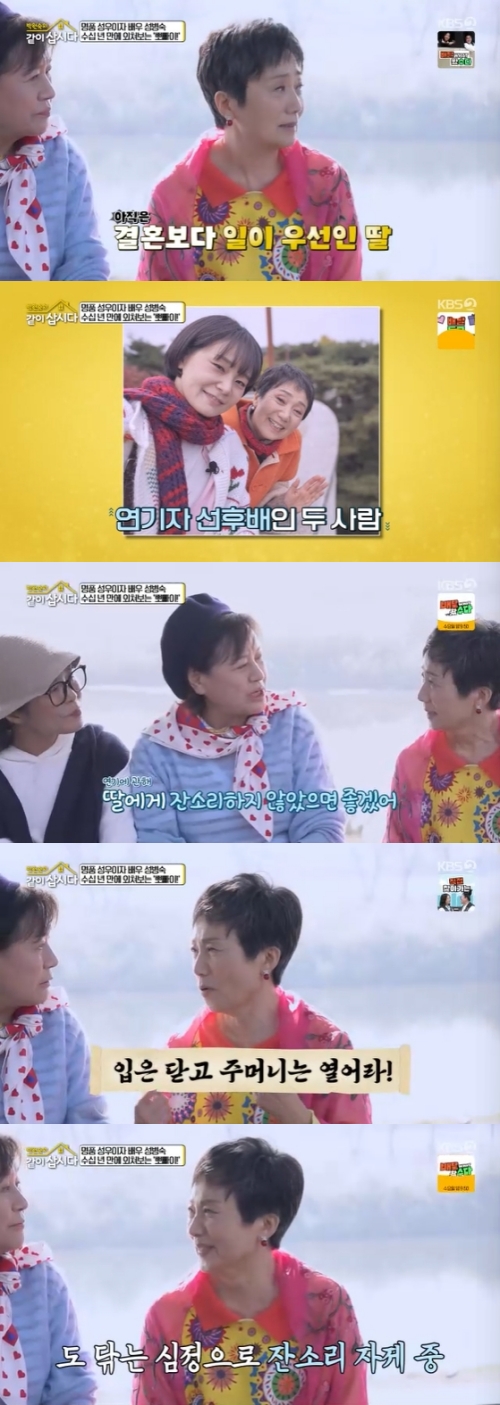 연기자 선후배인 모녀를 보면서 박원숙은 "자녀들이 같은 계통에 있으면 자꾸 잔소리를 하게 될텐데 하지 않았으면 좋겠다. 자연스럽게 할건데 호떡을 구워도 딸을 가르치면 '거기 두번 더 눌러' 그러게 될 거다. 더군다나 연기자면 색깔이 다른데 자꾸 내 색깔로 만들려고 하지마라. 같은 일을 한다니까 자녀는 좋지 않을 수도 있을 것 같다. 많은 제약을 받을 수도 있다"고 말했다.
