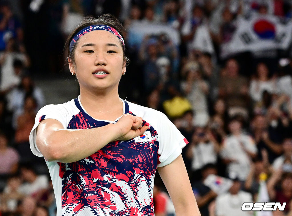 5일(한국시간) '셔틀콕 여제' 안세영(22, 삼성생명)이 꿈에 그리던 올림픽 금메달을 목에 걸었다.세계 랭킹 1위 안세영은 5일 오후(이하 한국시간) 프랑스 파리 포르트 드 라샤펠 경기장에서 열린 2024 파리올림픽 배드민턴 여자 단식 결승전에서 랭킹 9위 허빙자오(중국)를 2-0으로 꺾고 금메달을 획득 했다.  한국 안세영이 시상식에서 금메달을 깨물고 있다. 2024.08.05 / dreamer@osen.co.kr