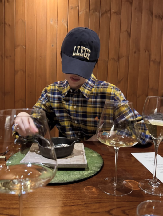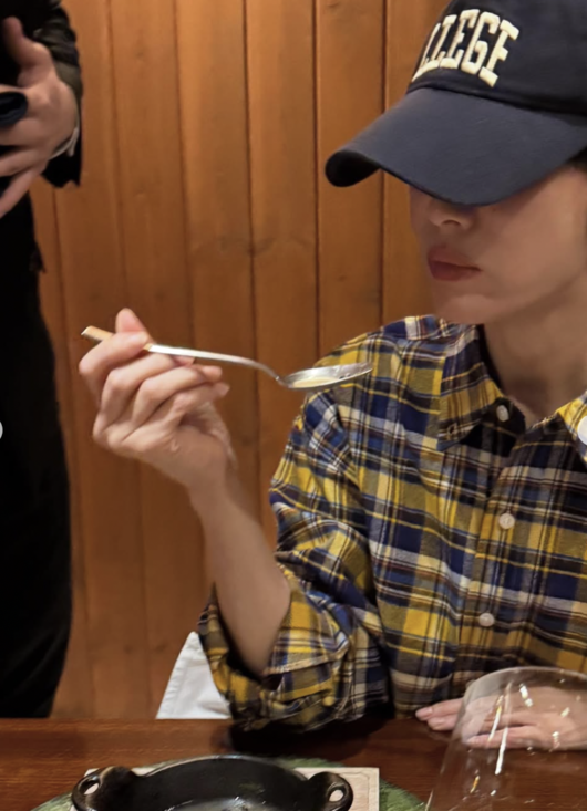 모자를 깊게 눌러쓴 캐주얼 스타일이지만, 무엇보다 시선을 강탈한 건 송혜교의 말도 안 되는 작은 얼굴. 챙이 큰 네이비 볼캡이 머리 전체를 덮어버릴 듯한 비율로, 마치 아이가 어른 모자를 쓴 듯한 귀여운 모습을 만들어냈다.