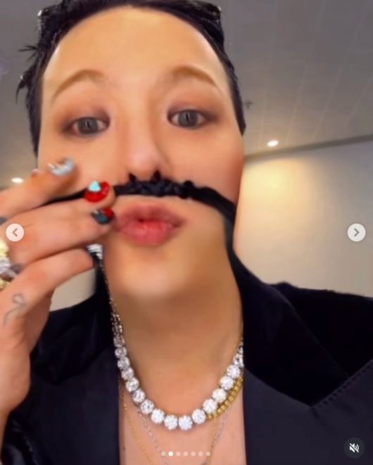 또 다른 사진에는 무대 준비 중인 모습도 담겨 있었다. 지드래곤은 길게 붙인 땋은 머리카락으로 콧수염을 만드는 등 장난을 치는가 하면, 수염이 자라고 화장기 없는 민낯을 담기도 했다.