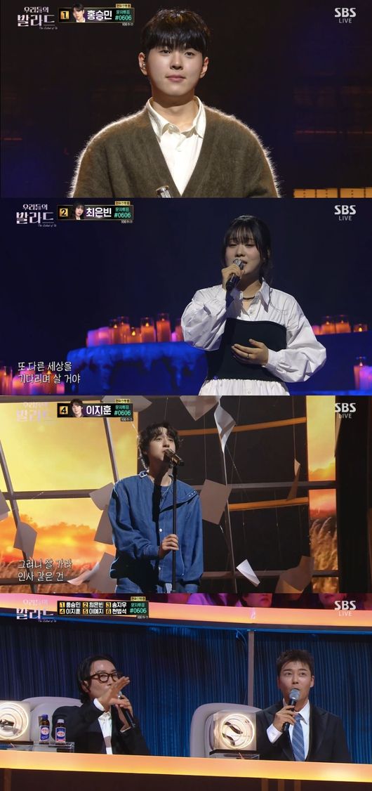 2일 방송된 SBS 예능 ‘우리들의 발라드’에서는 파이널 진출자인 TOP6 이지훈, 홍승민, 송지우, 천범석, 이예지, 최은빈이 마지막 무대를 선보였다.