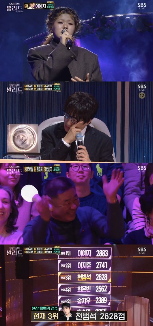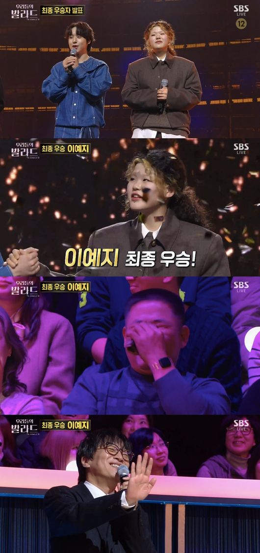 3위는 6703점의 천범석, 8668점으로 이지훈이 2위를 하면서 ‘우리들의 발라드’ 초대 우승자는 총점 10000점의 이예지가 차지했다. 이에 이예지는 “많은 분들이 앞으로의 제 오르막길을 궁금해주신 것 같아서 감사하고 아빠한테 고맙다”라고 소감을 전했다.