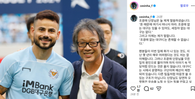 대구FC의 상징적 존재인 세징야가 또다른 상징적 존재인 대표이사에 대한 안타까운 심정을 숨기지 못했다.  조광래 대표이사가 결국 자리를 내려놓는다. 강등이라는 충격적 결과 직후, 그는 팬들에게 마지막 편지를 남기며 11년간의 시간을 스스로 마무리했다.