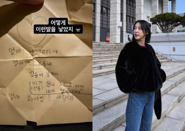 태리는 "그리고 이건 내가 접은거야. 엄마 화이팅! 사랑해"라고 애정 가득한 응원의 메시지를 남겼다. 이를 본 이지혜는 "어떻게 이런 딸을 낳았지ㅠ"라고 울컥하는 모습을 보였다.