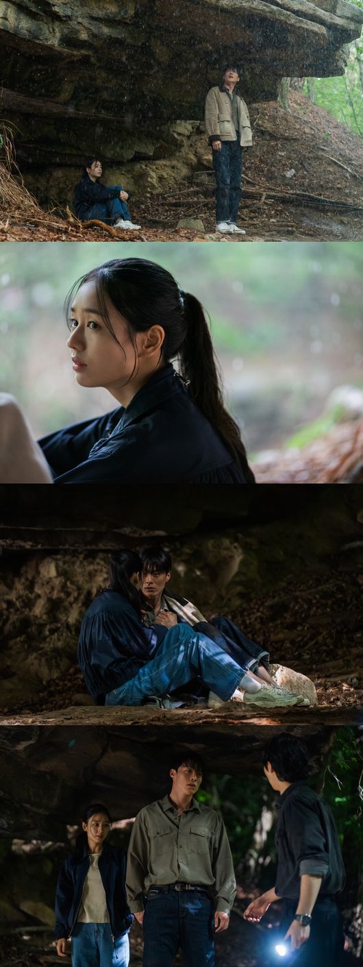 제작진이 공개한 사진 속 공지혁과 고다림은 거센 비가 쏟아지는 날 단둘이 산속의 동굴에서 비를 피하고 있다. 고다림이 몸을 웅크리고 있는 가운데, 공지혁은 고다림 곁에 다가서지 못하고 멀찍이 떨어져 있다. 대체 무슨 일이 생겼길래, 두 사람이 이렇게 산속에 둘이 갇히게 된 것인지 궁금증을 더한다.