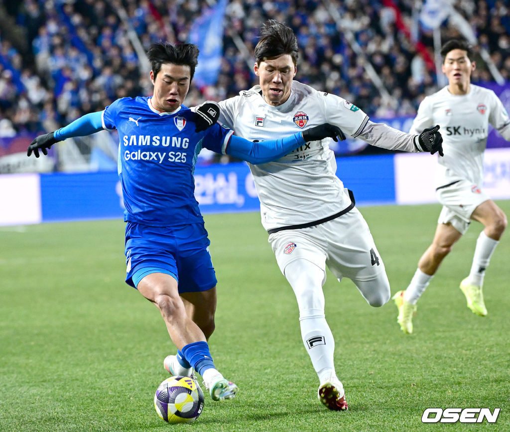 전반 수원 김지현과 제주 송주훈이 볼다툼을 벌이고 있다. 2025.12.03 / dreamer@osen.co.kr