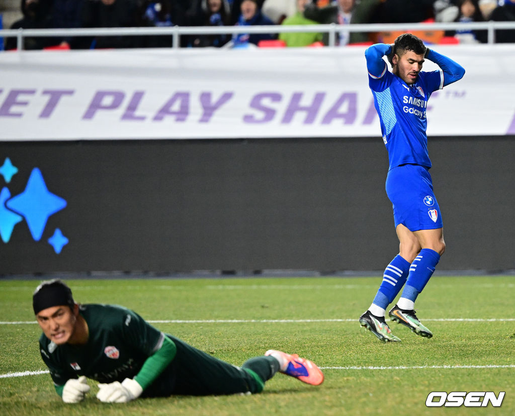 결정적 찬스 놓치고 아쉬워하는 수원 브루노 실바