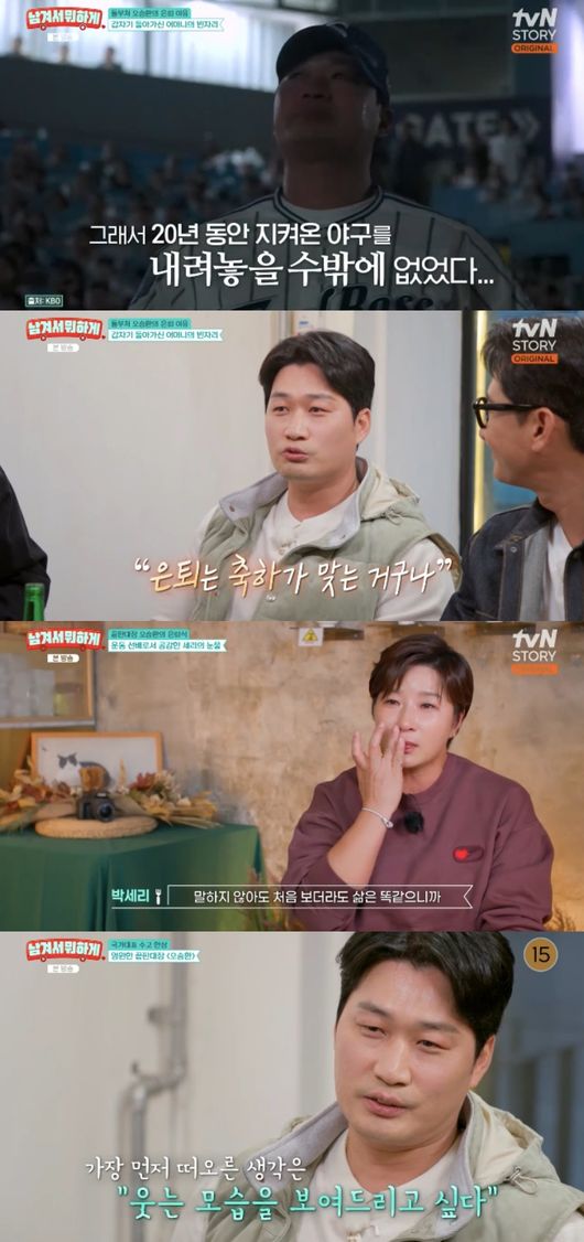 12일 방송된 tvN STORY 예능 ‘남겨서 뭐하게’에서는 ‘야구 레전드’ 박용택, 김선우, 오승환이 게스트로 출연한 가운데 오승환이 은퇴를 결심하게 된 이유를 밝혔다.