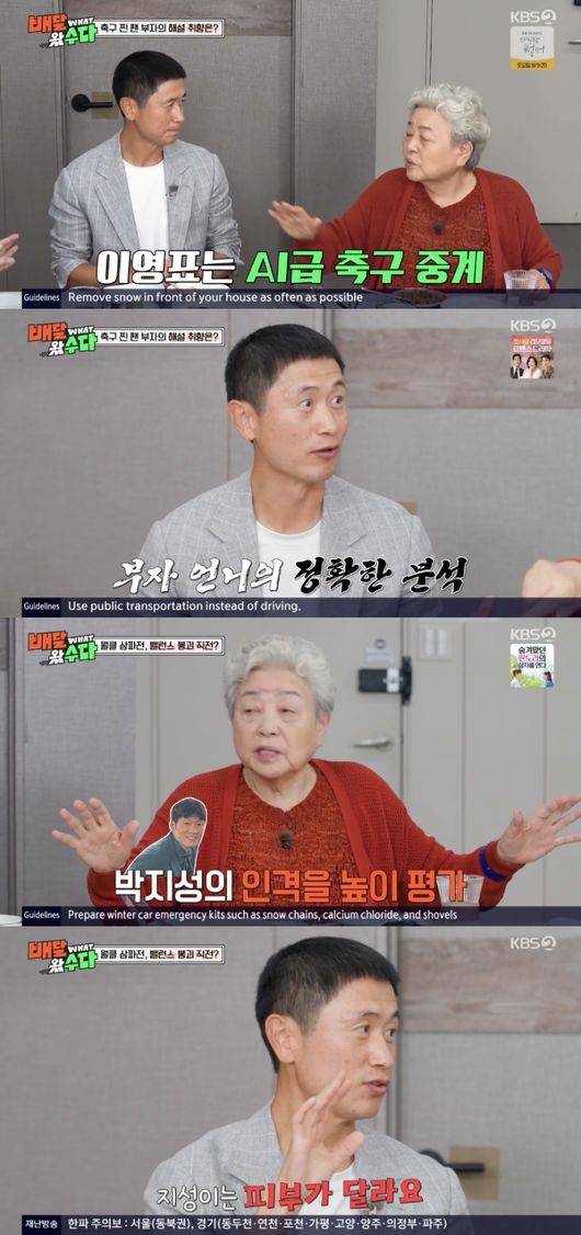 그러자 이영표는 “제가 중계할 때 바꿔야 할 게 있냐”고 물었고, 강부자는 “너무 매끄럽게 한다. 가끔은 우스갯소리도 하고 해야 한다”라고 조언했다.