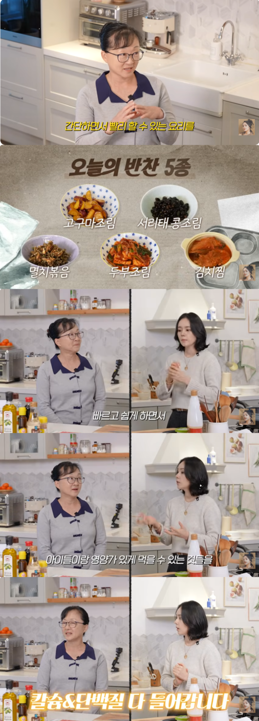 급식대가가 한가인에게 전수한 레시피는 온 가족이 좋아하는 밥도둑 메뉴인 김치찜, 아이들 영양 간식으로 좋은 검은콩조림과 고구마조림, 대표적인 밑반찬인 멸치볶음, 그리고 담백한 두부조림이었다.