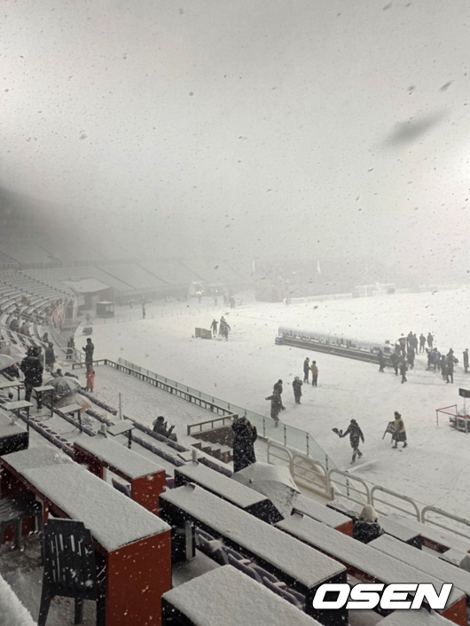 폭설이 축구를 멈춰 세웠다. K리그 전산 집계가 시작된 2010년 이후 '눈 때문에 취소'는 처음이다. 승강 승부의 긴장감은 그대로 얼어붙었고, 두 팀의 운명을 가를 무대는 하루 뒤, 5일로 미뤄졌다.