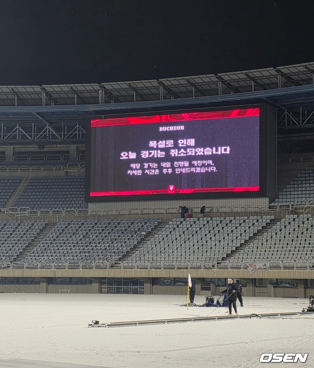 4일 오후 7시 부천종합운동장에서 열릴 예정이던 하나은행 K리그 2025 승강 플레이오프(PO) 1차전 부천FC1995-수원FC전이 폭설로 인해 취소됐다. 경기 시작 두 시간 전부터 내린 눈은 멈출 기미가 없었다. 관계자들은 장비를 동원해 제설 작업을 계속했지만, 눈은 더 빠르게 쌓였고, 그라운드는 금세 하얗게 사라졌다.
