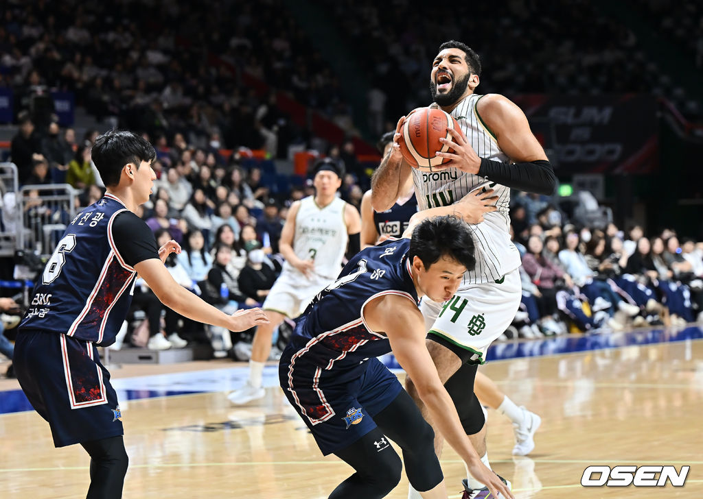 원주 DB 에삼 무스타파가 부산 KCC 허웅의 수비를 밀어 붙여 공격자 파울을 하고 있다. 2025.12.06 / foto0307@osen.co.kr