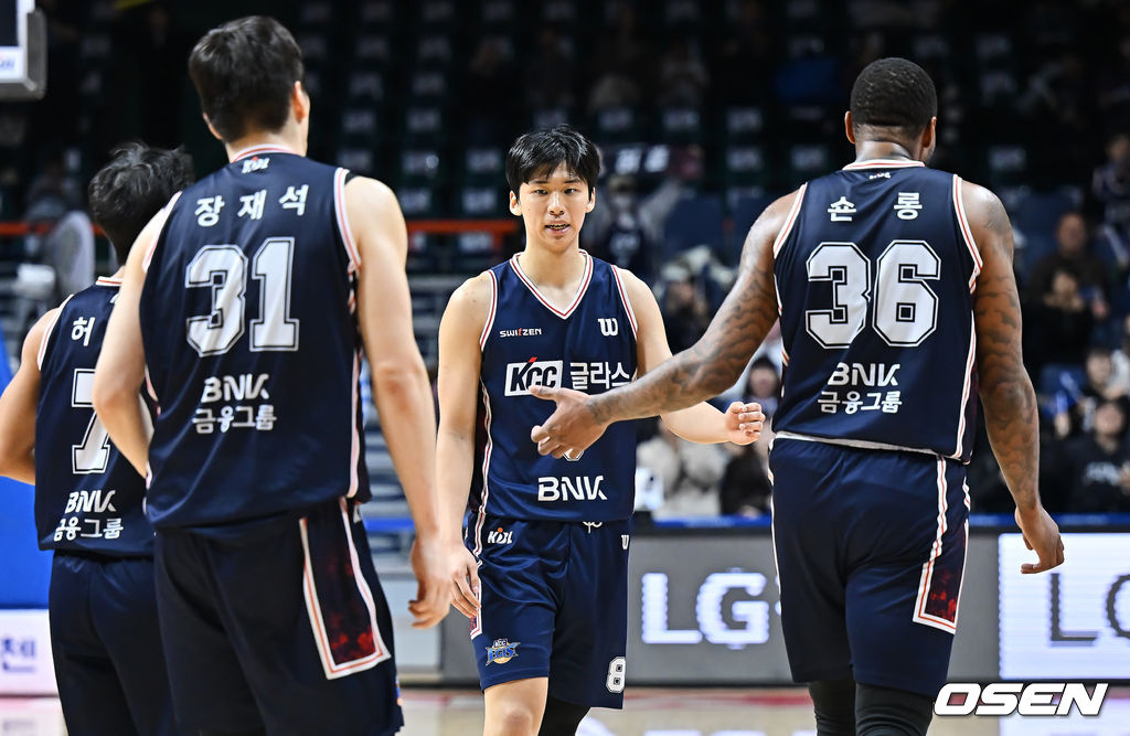 부산 KCC 윤기찬이 데뷔 첫 득점을 올리고 동료들과 하이파이브를 하고 있다. 2025.12.06 / foto0307@osen.co.kr
