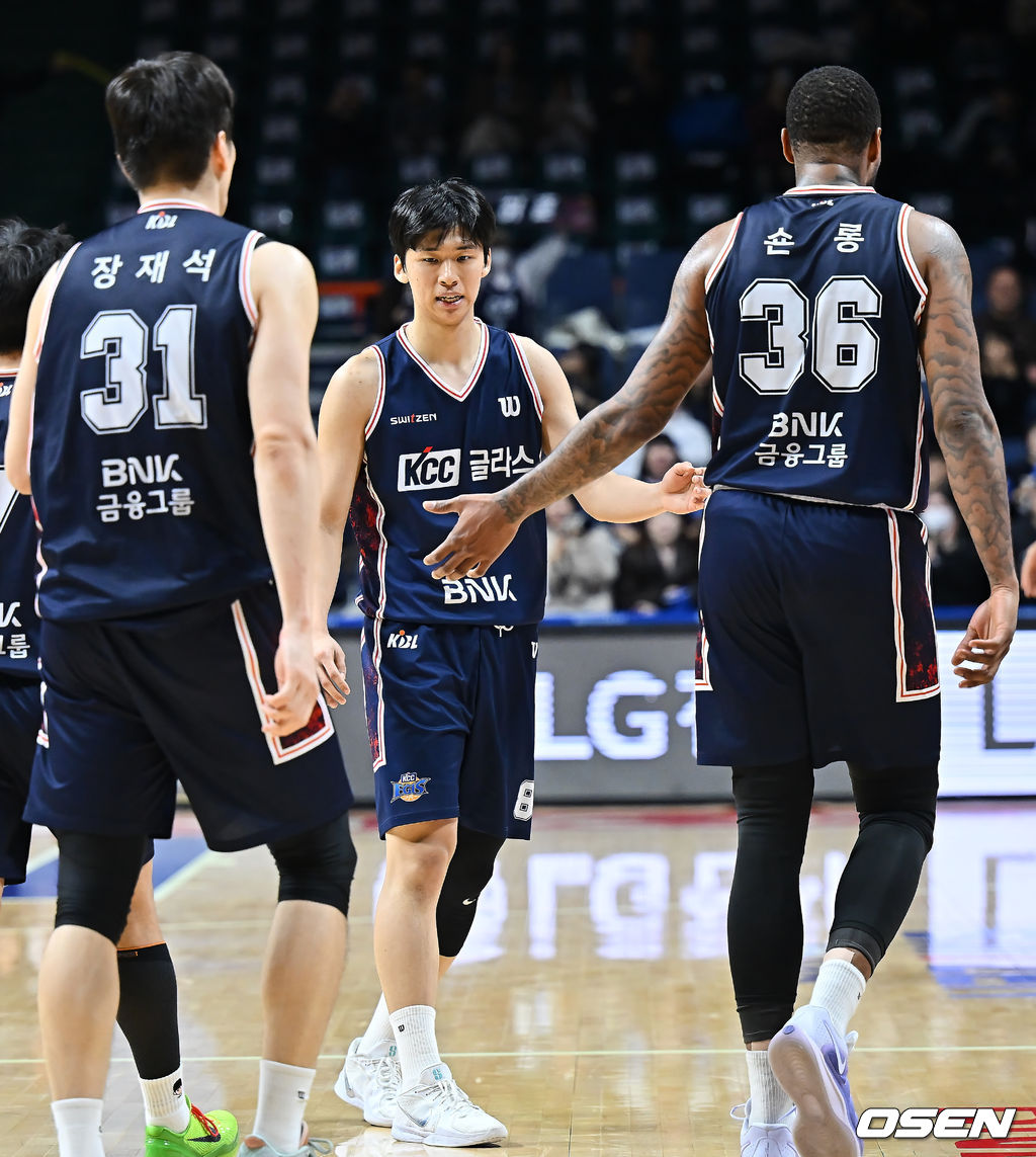 부산 KCC 윤기찬이 데뷔 첫 득점을 올리고 동료들과 하이파이브를 하고 있다. 2025.12.06 / foto0307@osen.co.kr