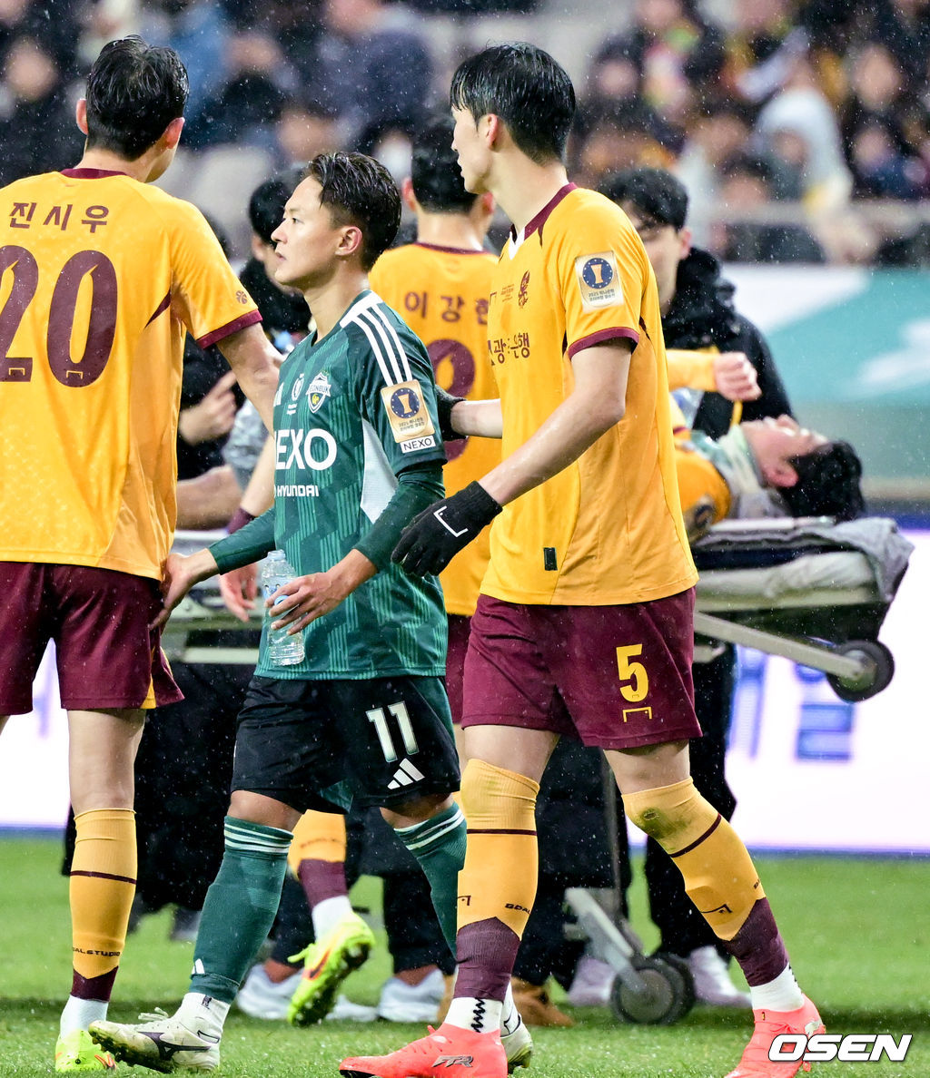 연장 후반 전북 이승우가 광주 권성윤을 향한 파울로 퇴장 당하고 있다. 권성윤은 구급차로 이송됐다. 2025.12.06 /cej@osen.co.kr