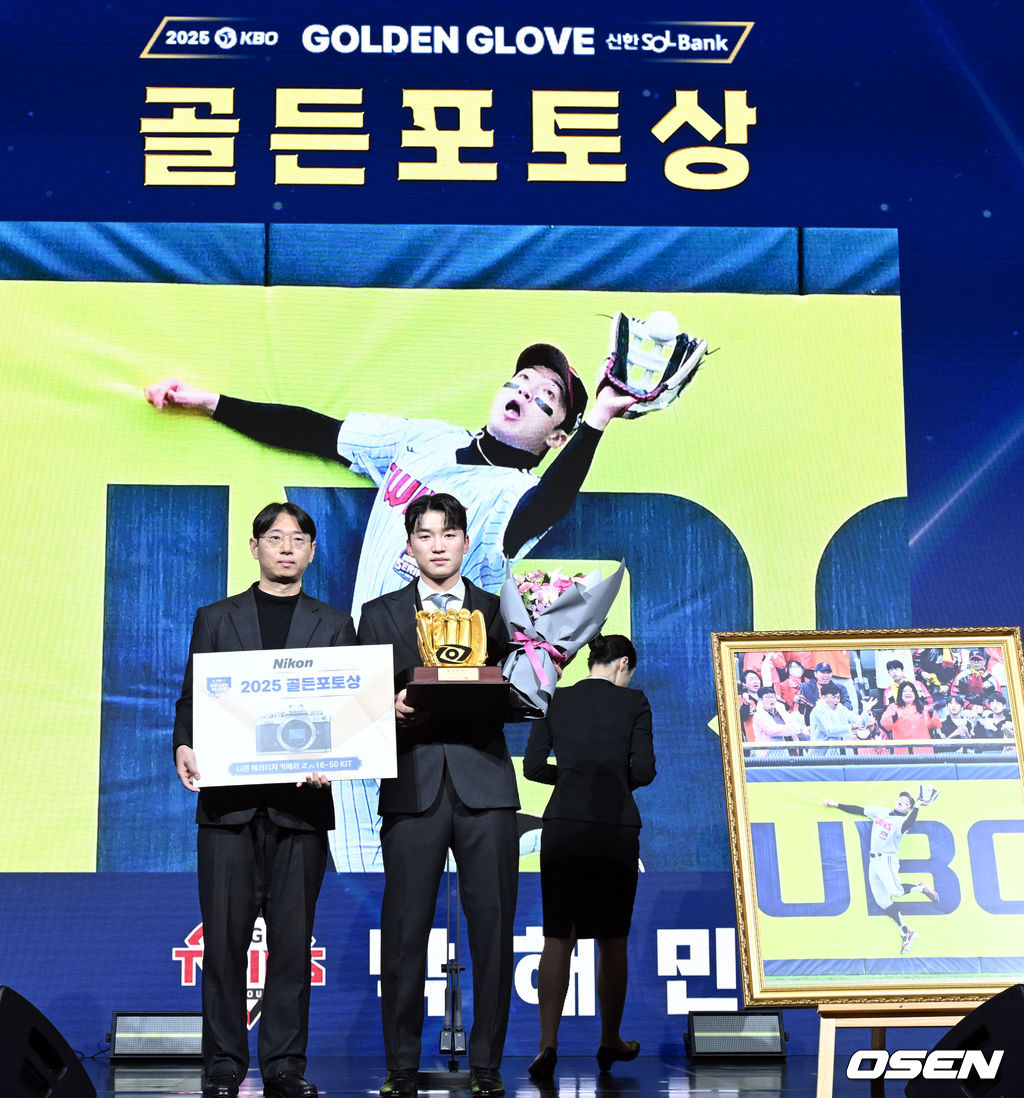 LG 트윈스 박해민이 9일 서울 송파구 잠실동 롯데호텔 월드에서 진행된 2025 신한은행 SOL 뱅크 KBO 골든글러브 시상식에서 골든포토상을 수상하며 한국스포츠사진기자회 지형준 회장과 기념촬영을 하고 있다.