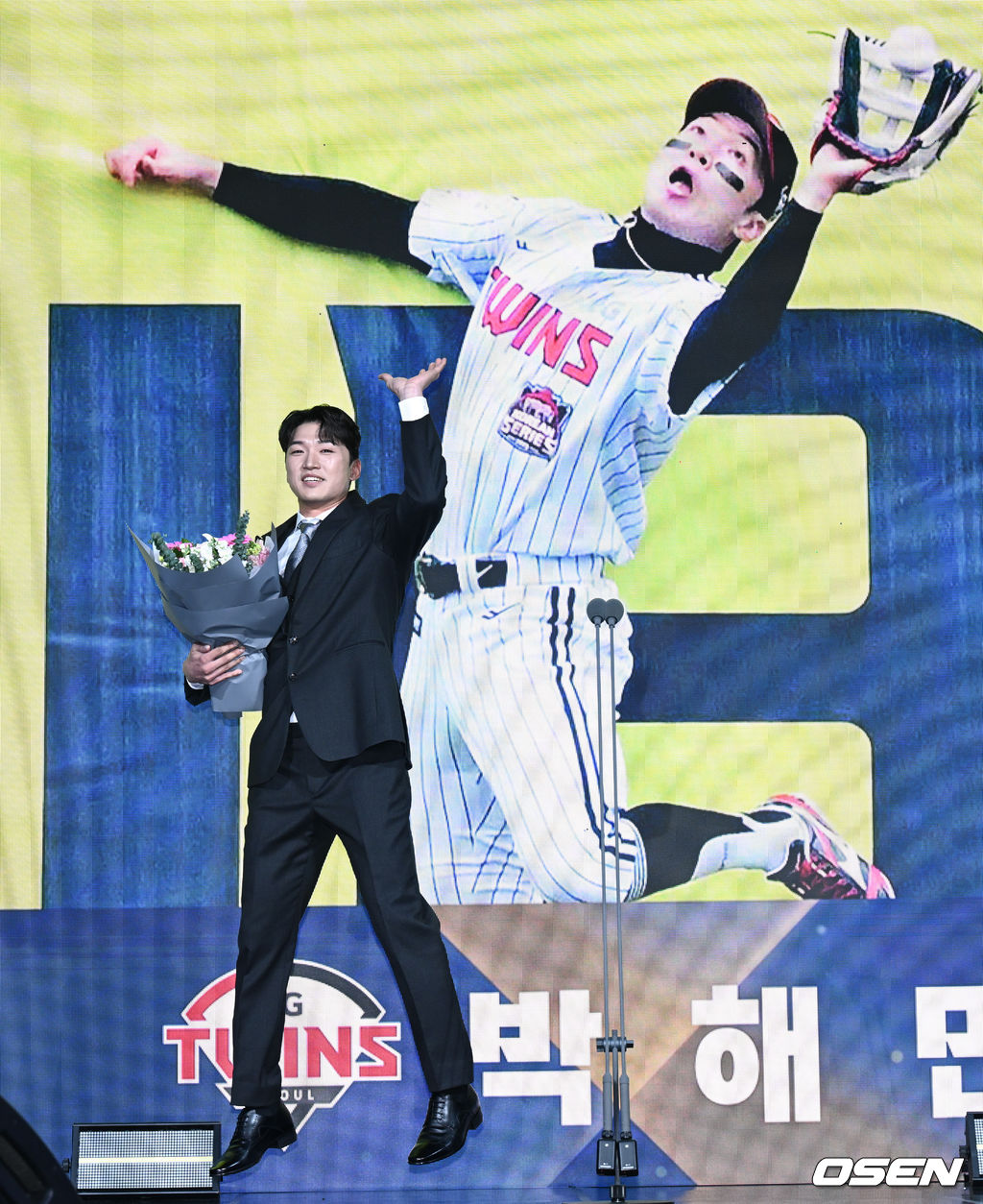 LG 트윈스 박해민이 9일 서울 송파구 잠실동 롯데호텔 월드에서 진행된 2025 신한은행 SOL 뱅크 KBO 골든글러브 시상식에서 골든포토상을 수상하며 장면을 재연하고 있다.