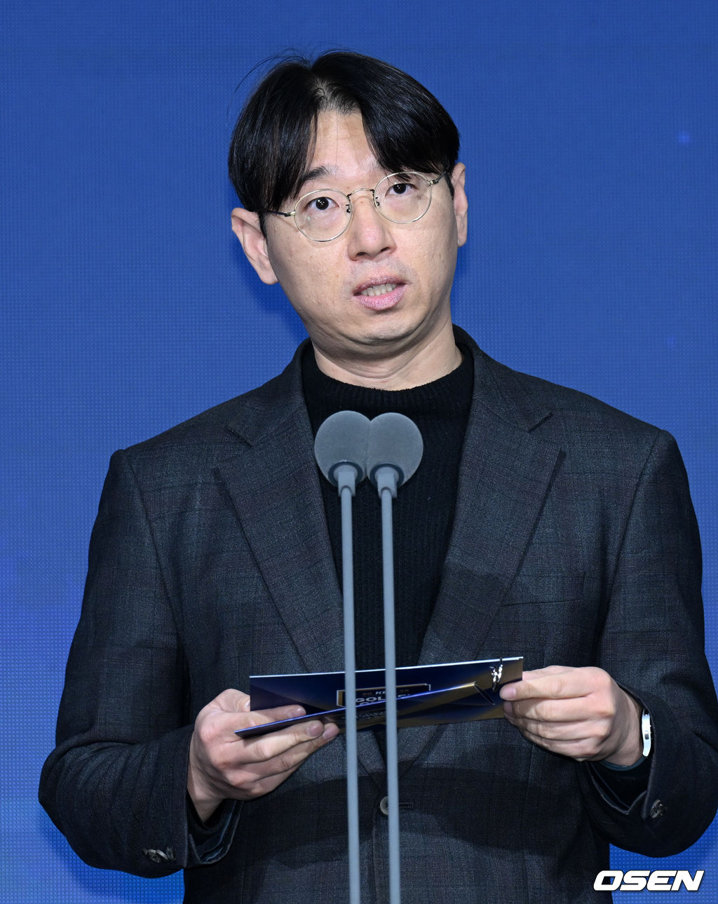 LG 트윈스 박해민이 9일 서울 송파구 잠실동 롯데호텔 월드에서 진행된 2025 신한은행 SOL 뱅크 KBO 골든글러브 시상식에서 골든포토상을 수상했다. 한국스포츠사진기자회 지형준 회장이 발표를 하고 있다.