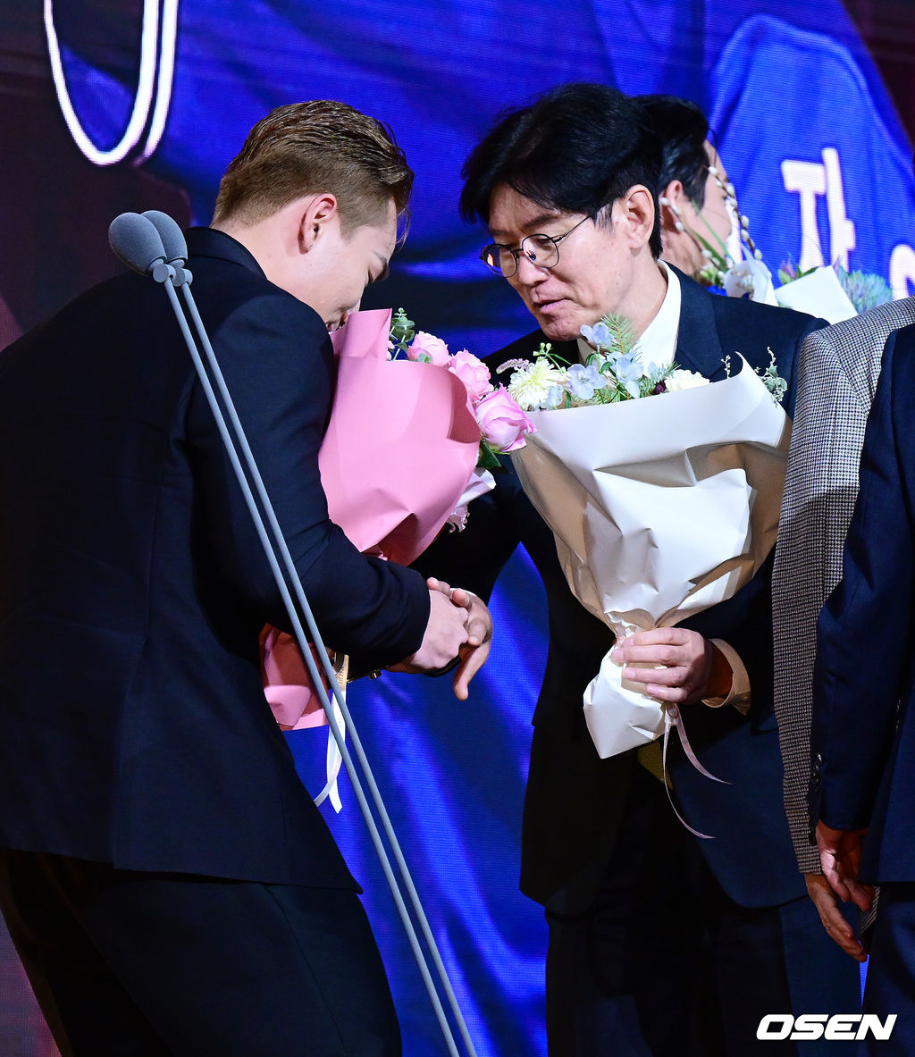 KT 안현민이 외야수 부문 골든글러브를 수상하며 이강철 감독의 축하를 받고 있다. 2025.12.09 /jpnews@osen.co.kr
