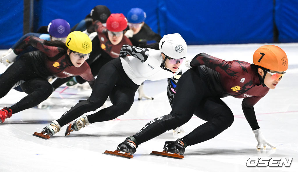 노도희(화성시청, 노랑), 이유빈(고양시청, 하양)김혜빈(화성시청, 주황)이 여자일반부 1500m 결승전에서 역주하고 있다. 2025.12.19 /cej@osen.co.kr