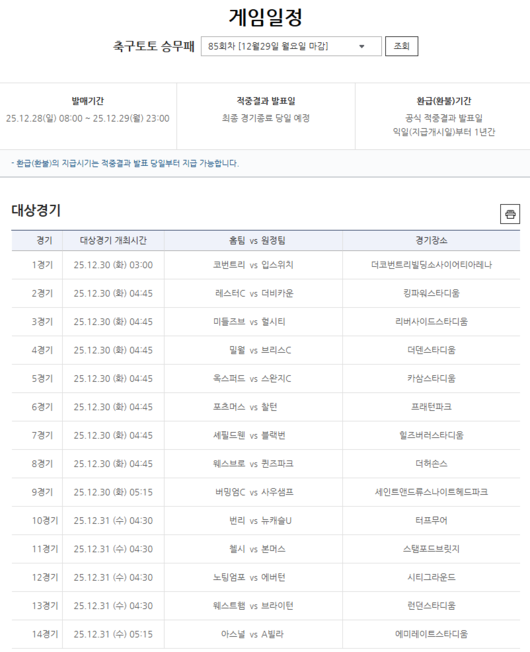 2025년 마지막 축구토토 승무패 85회차, 12월 29일(월) 오후 11시까지 구매 가능