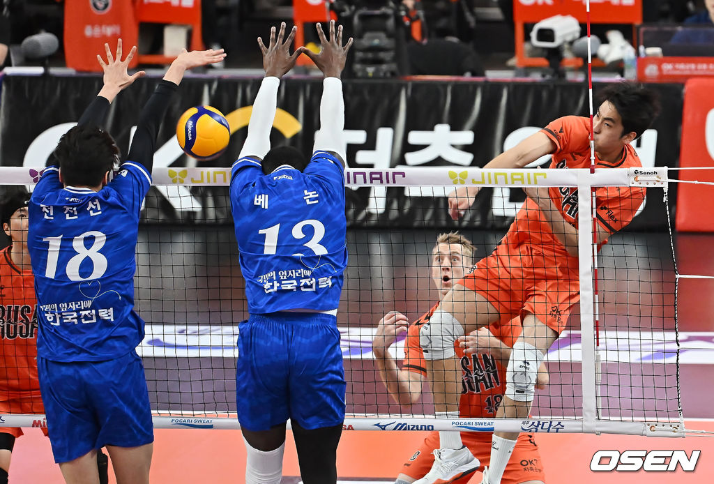 OK저축은행 차지환이 한국전력 전진선, 베논의 블로킹을 뚫고 스파이크를 날리고 있다. 2025.12.30 / foto0307@osen.co.kr