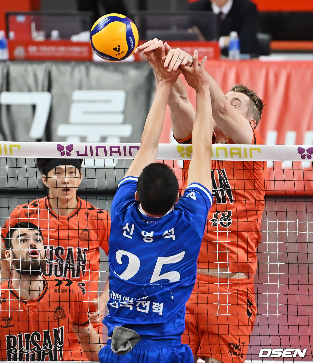 OK저축은행 오데이가 한국전력 신영석의 블로킹을 피해 밀어넣기 공격을 하고 있다. 2025.12.30 / foto0307@osen.co.kr
