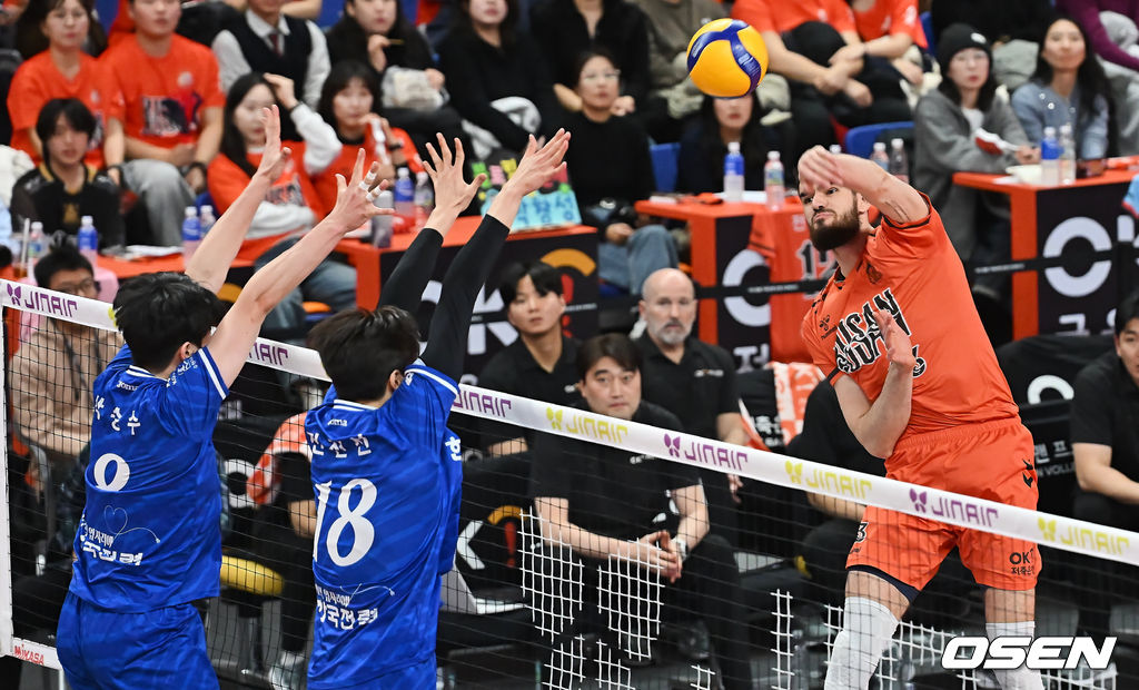 30일 부산 강서실내체육관에서 진에어 2025-2026 V리그 남자부 OK저축은행과 한국전력의 경기가 열렸다.