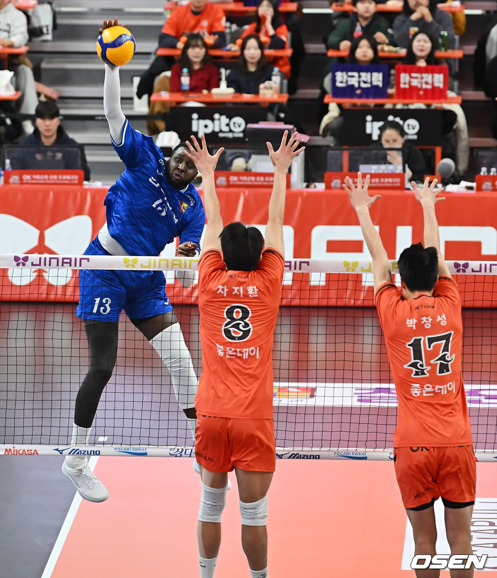 한국전력 베논이 OK저축은행 차지환, 박창성의 블로킹을 뚫고 스파이크를 날리고 있다. 2025.12.30 / foto0307@osen.co.kr