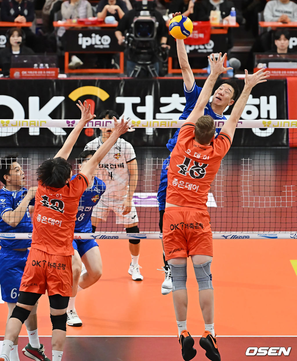 한국전력 신영석이 OK저축은행 전광인, 오데이의 블로킹을 뚫고 스파이크를 날리고 있다. 2025.12.30 / foto0307@osen.co.kr