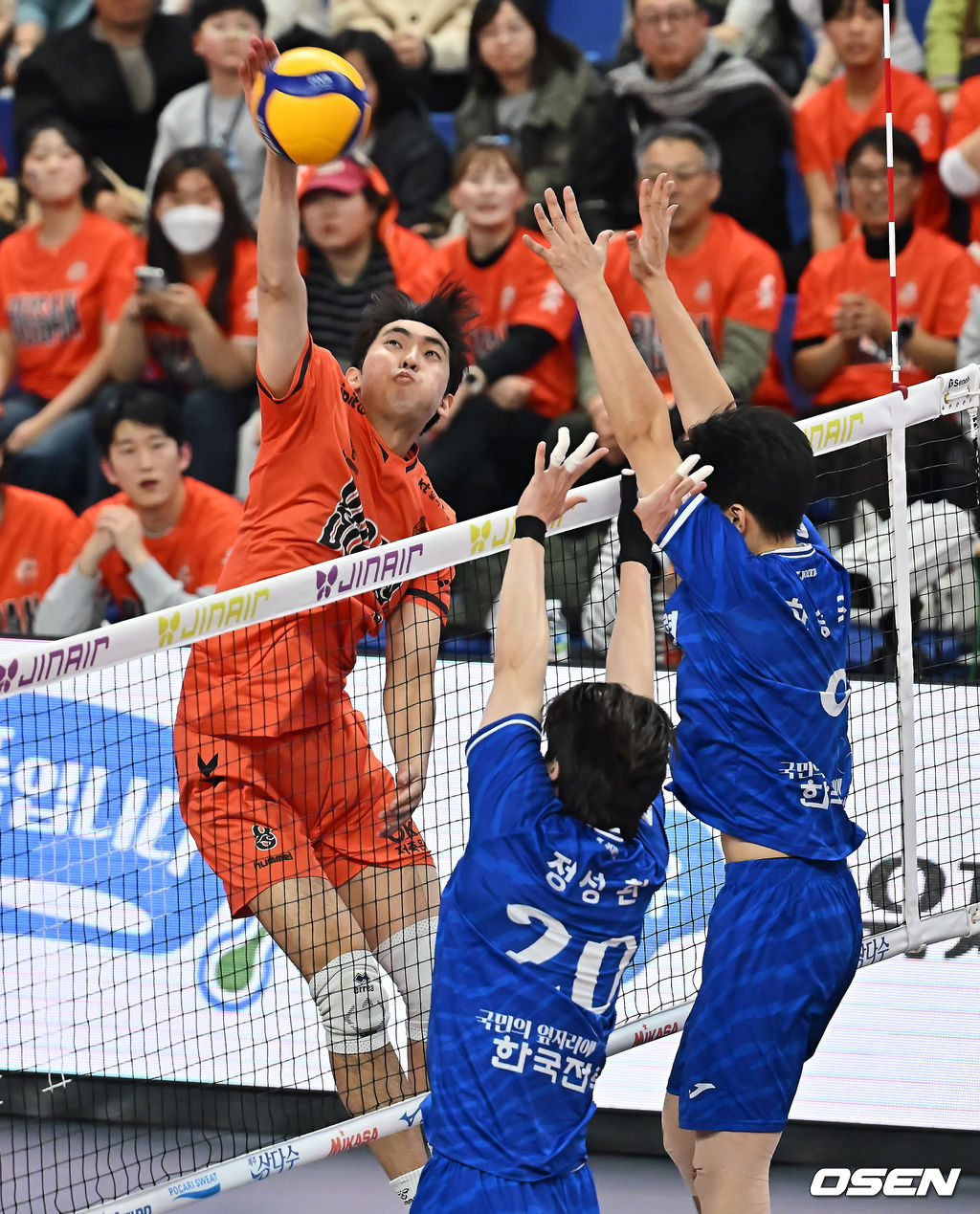 OK저축은행 차지환이 한국전력 정성환, 하승우의 블로킹을 뚫고 스파이크를 날리고 있다. 2025.12.30 / foto0307@osen.co.kr